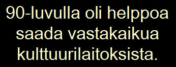 - Oli yllättävänkin helppoa saada vastakaikua kulttuurilaitoksista. Ehkä silloin oli jokin odotus ja uteliaisuusaspekti vammaisten taidetoimintaa kohtaan. Se oli uusien aloitteiden aikaa ja vammaisten näkökulmasta asioita saatiin vietyä eteenpäin.